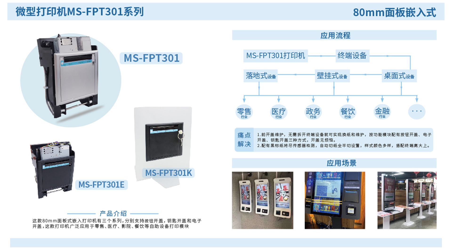 美松MASUNG微型打印機(jī)廣泛應(yīng)用在落地式、壁掛式、桌面式自助終端設(shè)備上,實(shí)現(xiàn)打印票據(jù)功能的模塊。在金融行業(yè),微型打印機(jī)可嵌入ATM機(jī)、自助繳費(fèi)機(jī)、自助存取款機(jī)提供打印需求;在醫(yī)療服務(wù)行業(yè),微型打印機(jī)嵌入自助掛號繳費(fèi)機(jī)、自助取單查詢機(jī)提供打印模塊;在消費(fèi)零售行業(yè),微型打印機(jī)為自助售貨機(jī)、自助加油機(jī)、自助點(diǎn)餐機(jī)、自助取票機(jī),新零售自助結(jié)算機(jī)等自助設(shè)備提供排號打印的功能;在公共服務(wù)行業(yè),微型打印機(jī)適配AFC系統(tǒng),自助圖書館服務(wù)機(jī)、自助稅務(wù)機(jī)等終端設(shè)備,提供打印模塊。