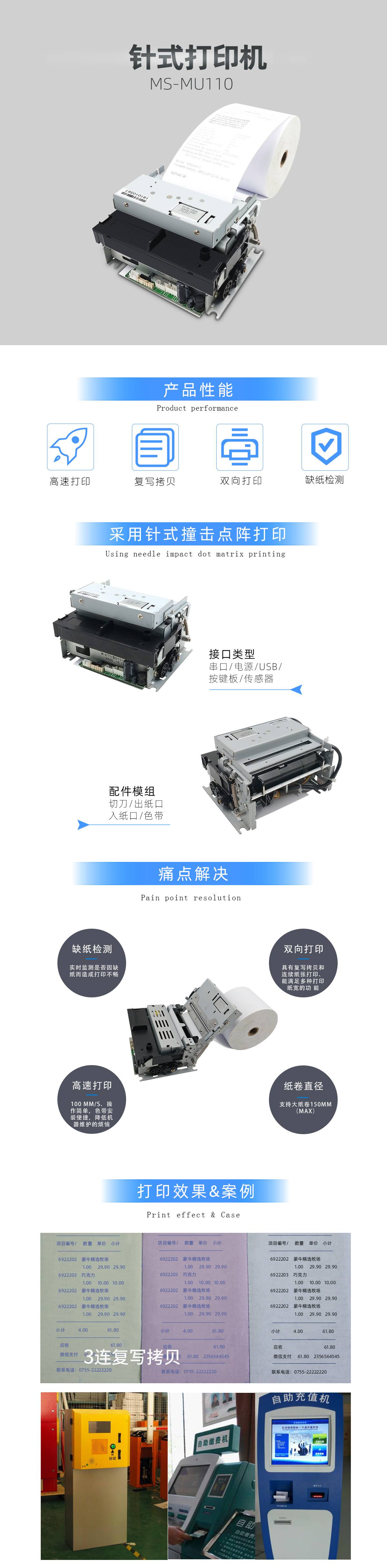 MS-MU110打印一體機是由原裝愛普生M-U110針式打印機機芯,與公司自主研發(fā)的針式打印機控制主板相結(jié)合的一款打印一體機MS-MU110,是一種針式撞擊點陣打印方式的打印機,可靠性強,打印速度快,具有復(fù)寫拷貝和連續(xù)紙張打印的功能,控制板結(jié)構(gòu)小巧,操作簡單,色帶安裝便捷,降低機器維護(hù)的煩惱。