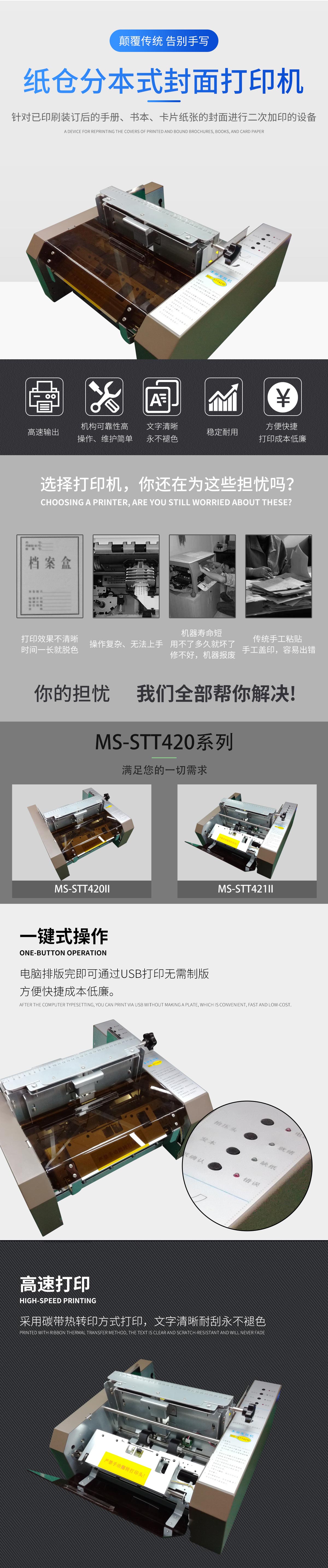 美松MS-STT420II是熱轉(zhuǎn)印設(shè)備,利用熱轉(zhuǎn)印技術(shù),實現(xiàn)紙倉分本式封面打印機針對已印刷裝訂后的手冊,書本,卡片紙張的封面進行二次加印的設(shè)備.采用碳帶熱轉(zhuǎn)印方式打印,文字清晰耐刮永不褪色.電腦排版完即可通過USB打印無需制版,方便快捷成本低廉.可調(diào)打印件厚度及可調(diào)紙倉式多本裝入,機構(gòu)可靠性高,操作,維護簡單.