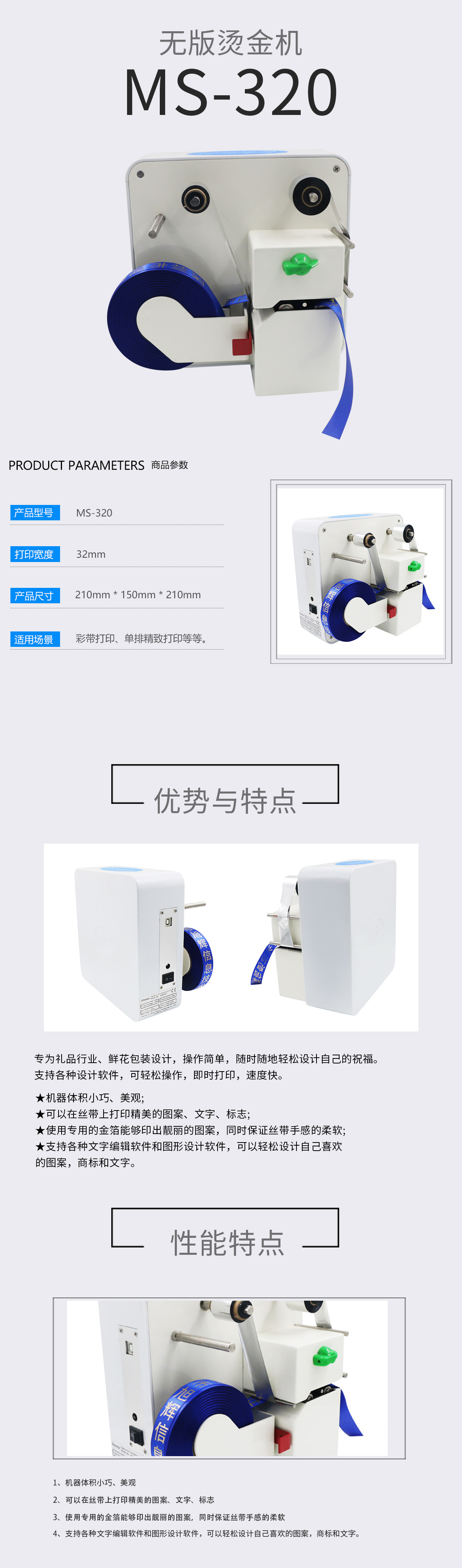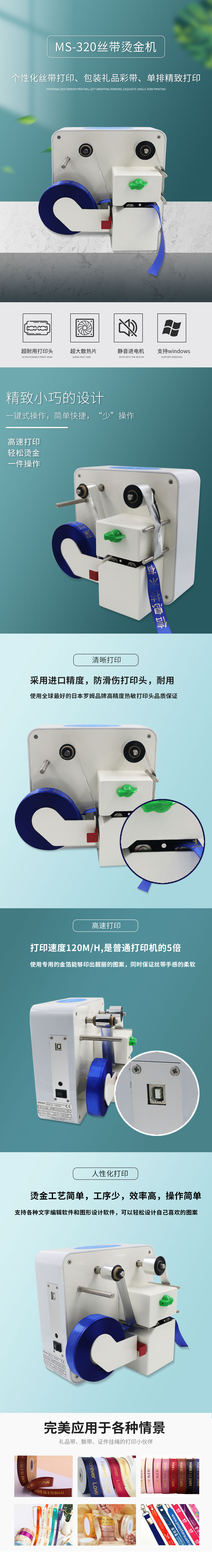 美松全自動絲印機(jī) 1.機(jī)器體積小巧,美觀(桌面擺設(shè)) 2.速度快(是普通打印機(jī)的5倍) 3.在絲帶上打印精美的圖案,文字,標(biāo)志 4.使用專用的金箔能夠印出靚麗的圖案,同時保證絲帶手感的柔軟 5.支持各種文字編輯軟件和圖形設(shè)計軟件,自定義打印商標(biāo)和文字