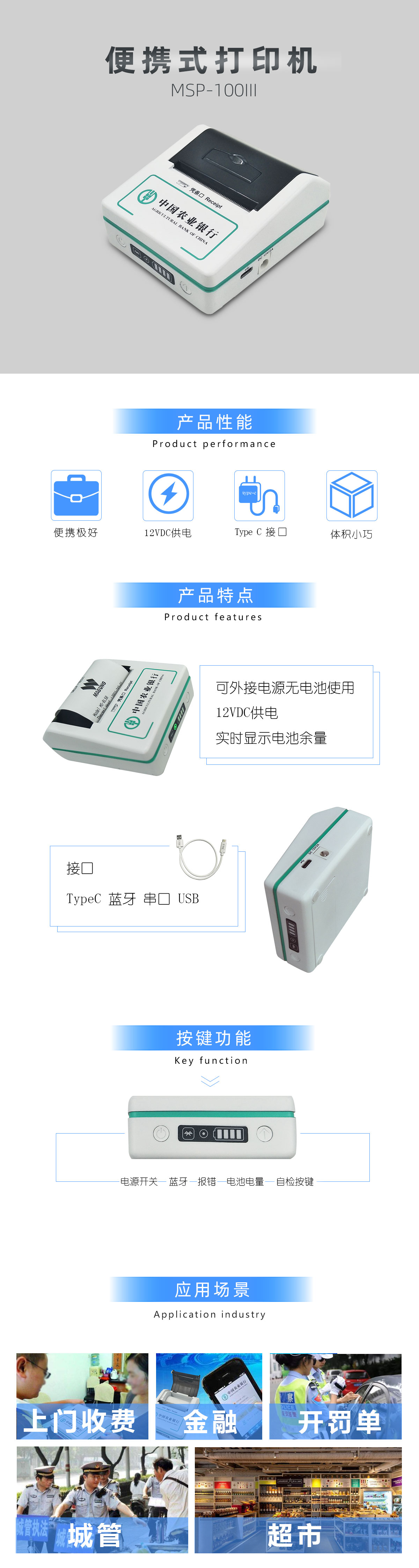 美松MASUNG自主研發(fā)便捷式打印機 1.ESC/POS?標準的命令協(xié)議 2.12VDC供電,可外接電源無電池使用 3.支持TypeC,藍牙,串口,USB接口 4.支持位圖打印,條形碼打印