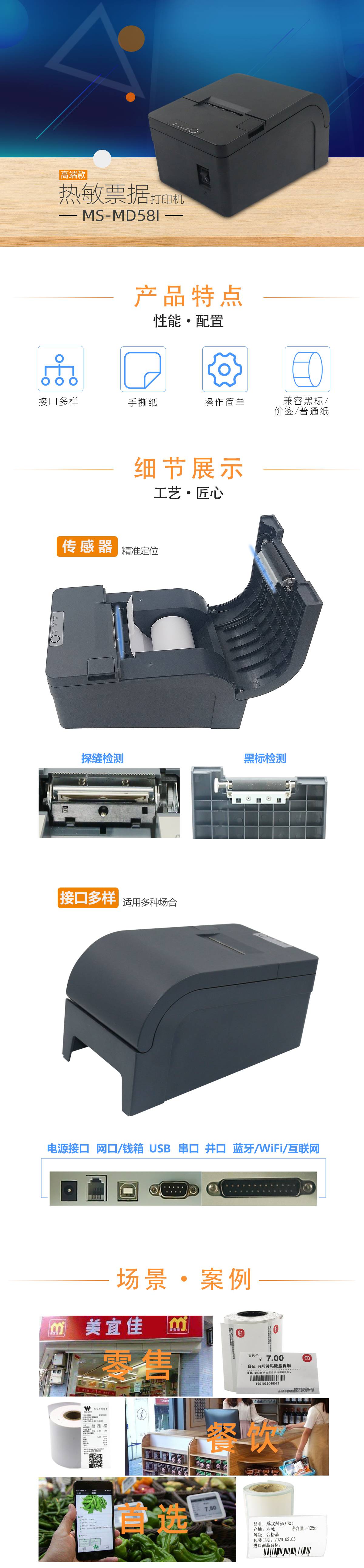 美松MS-MD58I打印機是熱敏小票打印機58mm前臺后廚房超市餐廳收銀票據(jù)打印機,用于便利店商超餐飲收銀,可滿足價簽打印,熱敏紙打印,黑標紙打印,不干膠紙打印,標簽紙打印功能;具有高速打印,噪聲低,可靠性強,打印質(zhì)量高,切紙厚度大,結(jié)構(gòu)小巧等特點;打印機擁有易裝紙,手撕切紙等功能.