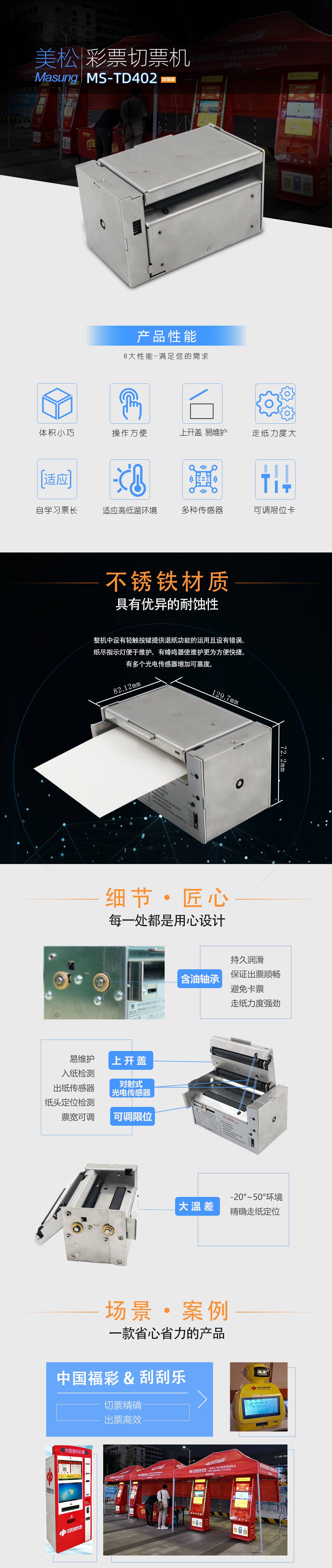 美松MASUNG自主研發(fā)即開型彩票切票機(jī) 1.切刀是鈍刀鋒,沒有刀片磨損無法切票的情況,保證彩票的分割質(zhì)量 2.Windows/ Android在線遠(yuǎn)程升級(jí)功能 3.USB/RS232兩種接口,適用領(lǐng)域廣 4.送票軸有兩組,保證送票時(shí)順暢,避免卡票 5.不銹鐵材質(zhì),結(jié)構(gòu)強(qiáng)度高,工作可靠適用領(lǐng)域廣