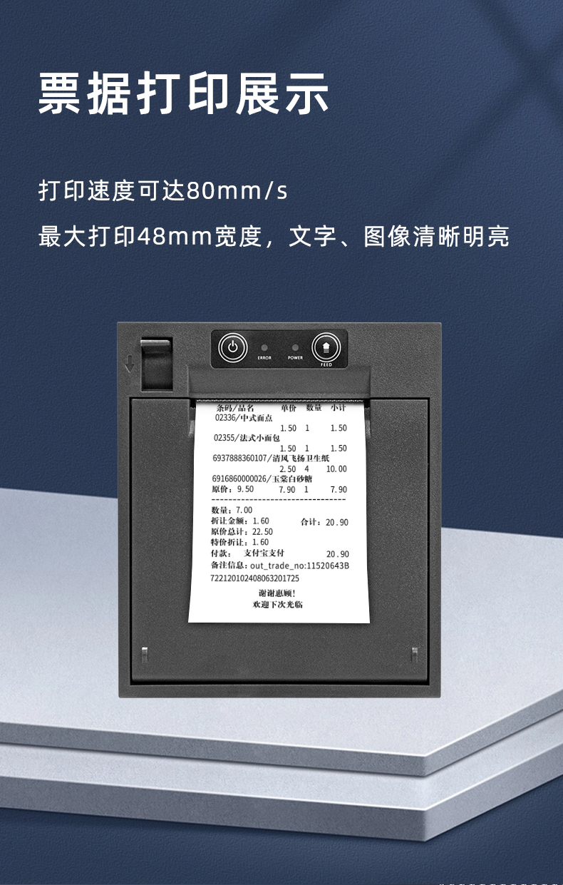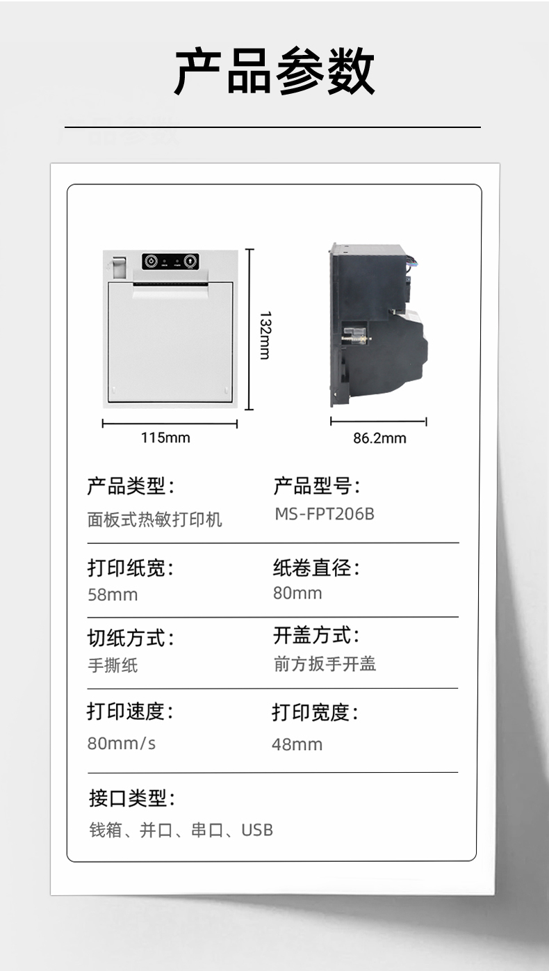 微型打印機(jī)介紹:美松根據(jù)微型打印機(jī)市場(chǎng)需求,自主研發(fā)一款58mm微型熱敏打印機(jī),這款微型打印機(jī)面框兼容80mm打印機(jī)尺寸,帶有錢(qián)箱接口,收銀系統(tǒng)兼容性好,紙倉(cāng)空間較大,可以裝60mm直徑紙卷,外觀(guān)簡(jiǎn)潔大方,耐用不易損壞,適應(yīng)多種場(chǎng)景,滿(mǎn)足微型打印機(jī)品牌不同需求。型號(hào)為MS-FPT206微型打印機(jī)是一款嵌入式微型打印機(jī),不同于POS打印機(jī)可以隨身攜帶,嵌入式微型打印機(jī)只需要簡(jiǎn)單安裝就能實(shí)現(xiàn)打印功能的打印模塊,MS-FPT206可嵌入在不同的終端設(shè)備,例如加油站、餐飲收銀機(jī)等,微型熱敏打印機(jī)是零售、餐飲、娛樂(lè)、醫(yī)療、物流等行業(yè)的自助終端設(shè)備理想打印伙伴。
