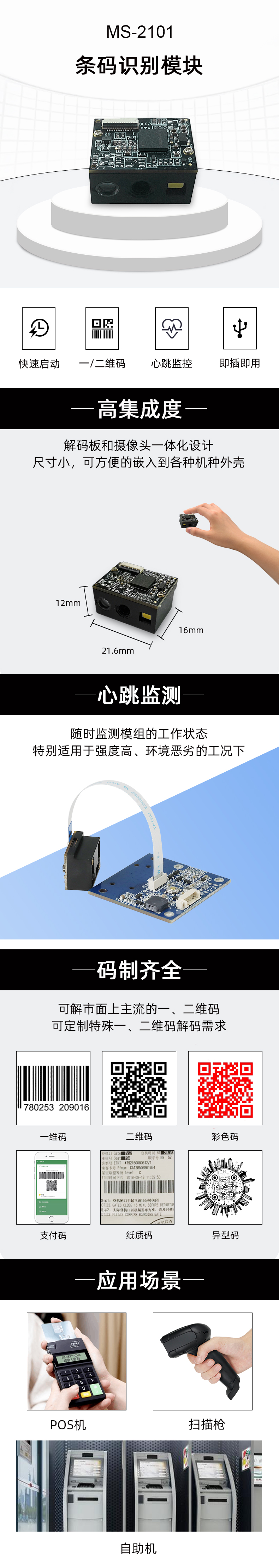 帶補光燈和指示燈,對紙質(zhì)條碼掃描效果好 采用廣角鏡頭,掃碼可以貼的更近,符合貼近掃描習(xí)慣 心跳監(jiān)測在線狀態(tài) 兼容市面上常見模組固定孔 選配轉(zhuǎn)接板可端子線連接RS232,TTL3.3V,TTL5V,USB,USB虛擬串口