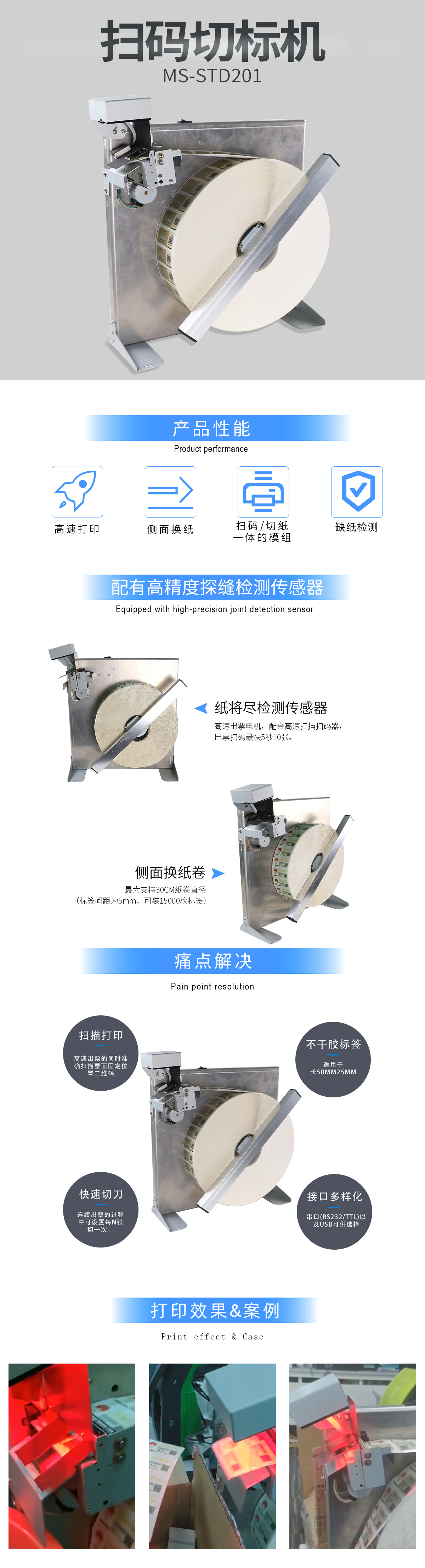 美松品牌MASUNG掃碼切標(biāo)機(jī)MS-STD201是一套集出票、掃碼、切紙為一體的模組。對(duì)于自帶二維碼的不干膠票紙,可以在高速出票的同時(shí)快速掃碼,還可以設(shè)定出固定張數(shù)的票后切紙,適用于把標(biāo)簽掃碼錄入后再用于商品包裝粘貼的情況。