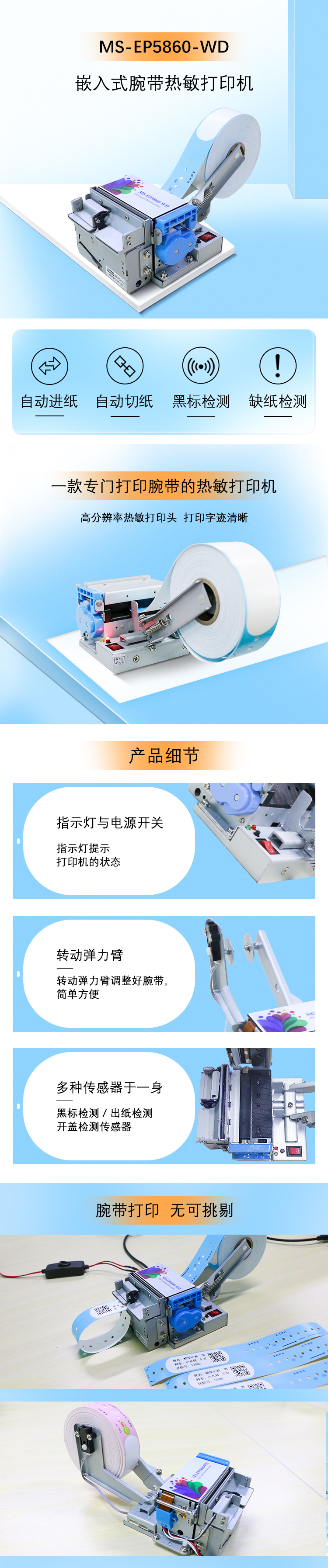 MS-EP5860-WD 是一款專門打印腕帶的熱敏打印機(jī),特點如下: 1、可裝入紙卷直徑最大可允許 120mm; 2、紙架可以打開,可側(cè)開裝紙; 3、體型小、機(jī)頭高度低,適合小空間安裝; 4、有出紙檢測傳感器,腕帶有沒有被拿走,狀態(tài)清晰; 5、適合市場常見各種寬度熱敏腕帶