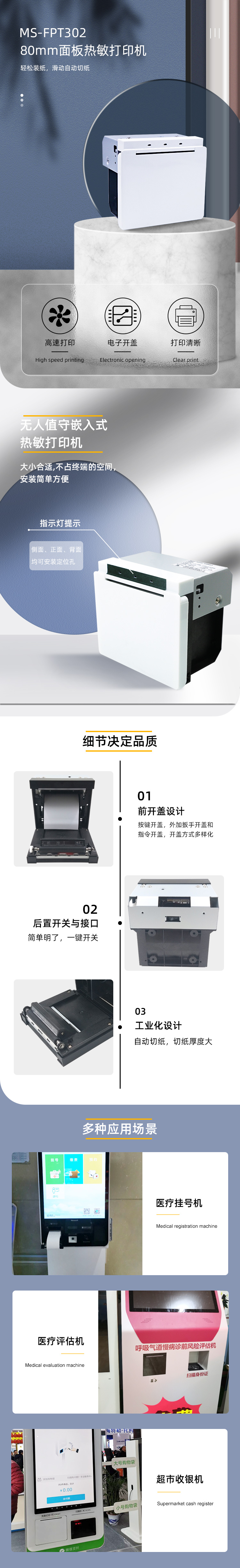 嵌入式熱敏打印機(jī) 1.高速熱敏打印、噪聲低、可靠性強(qiáng)、切紙厚度大等特點(diǎn) 2.MS-FPT302定位孔可安裝在側(cè)、前、后三面,安裝維修方便快捷 3.易裝紙、滑動(dòng)式自動(dòng)切紙等功能 4.紙將盡可手動(dòng)調(diào)節(jié)大小,最精確的紙將盡檢測(cè)(可精確張數(shù)) 5.開(kāi)蓋方式:扳手開(kāi)蓋;電子開(kāi)蓋;電腦指令開(kāi)蓋 6.多樣傳感器協(xié)助控制且?guī)в卸录埰鳈z測(cè)功能 7.無(wú)人值守內(nèi)嵌式熱敏打印機(jī) 8.醫(yī)療、政務(wù)、零售、餐飲等行業(yè)的自助終端打印設(shè)備