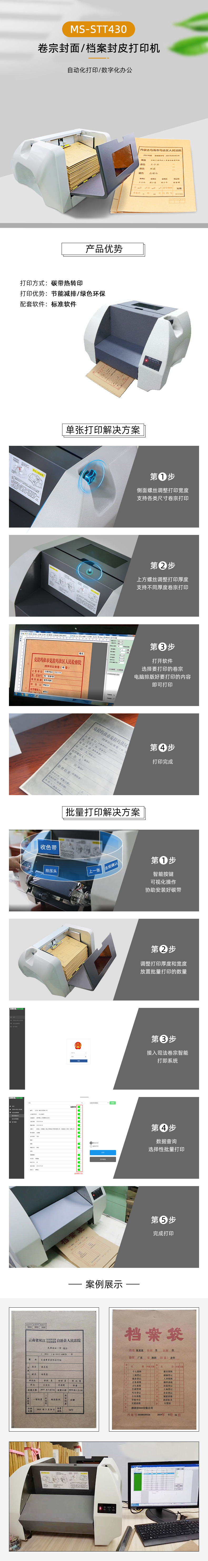 美松MS-STT430是一款批量打印或者單個打印的檔案袋、卷皮封面的打印機,采用碳帶熱轉(zhuǎn)印方式打印,文字清晰耐刮永不褪色.電腦排版完即可通過USB打印無需制版,方便快捷成本低廉.具有可調(diào)節(jié)紙倉式,批量多本裝入打印方式;機構(gòu)可靠性高,操作,維護簡單.