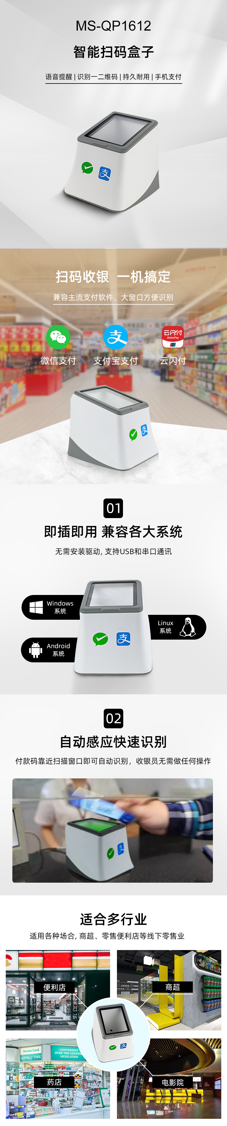 1.大窗口,經(jīng)典外觀,支持貼屏掃碼 2.支持微信、支付寶、美團等掃碼支付 3.掃碼成功語音播報 ,解放收銀員,避免漏單 4.接口豐富,內(nèi)置RS232 和USB接口