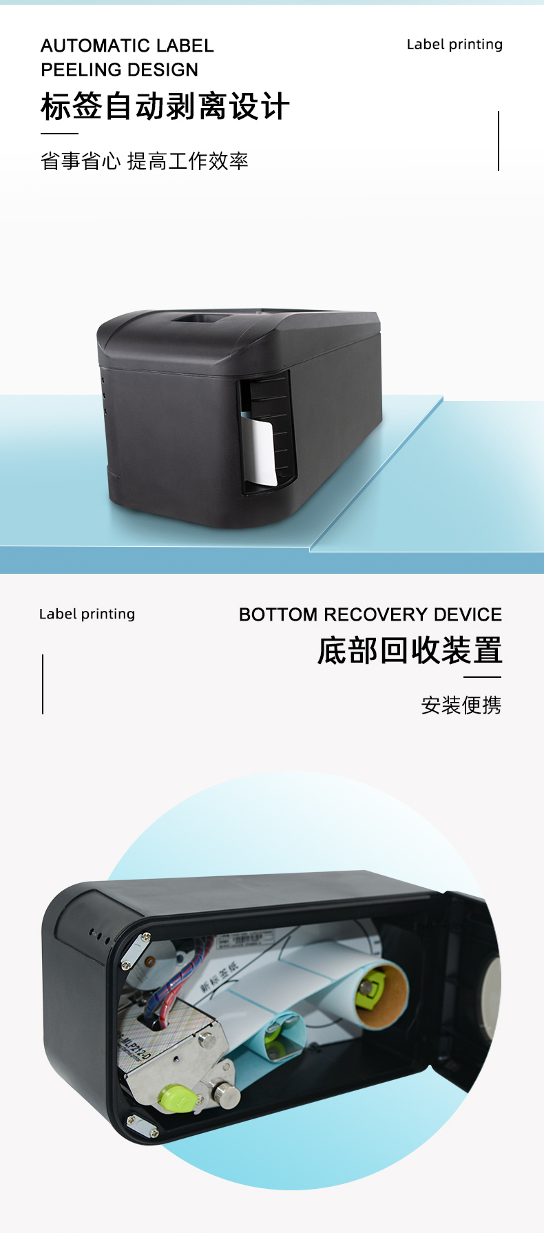 標(biāo)簽打印一體機(jī) 45°角斜出紙 回收底紙裝置 為零售新零售等行業(yè)提供解決方案.