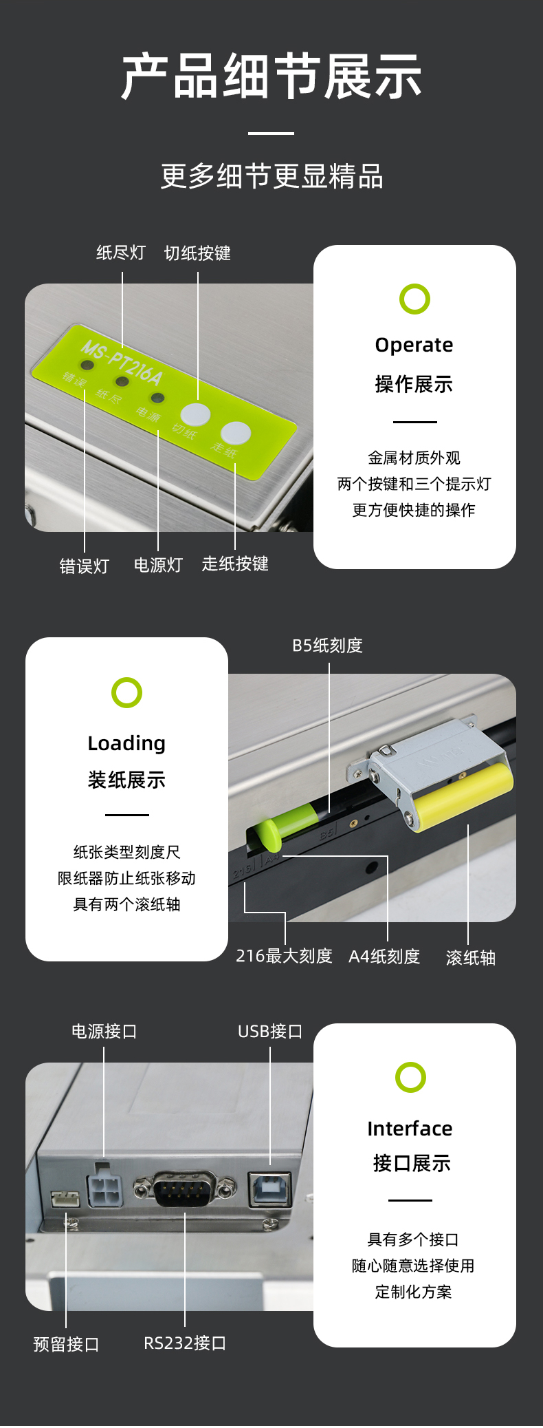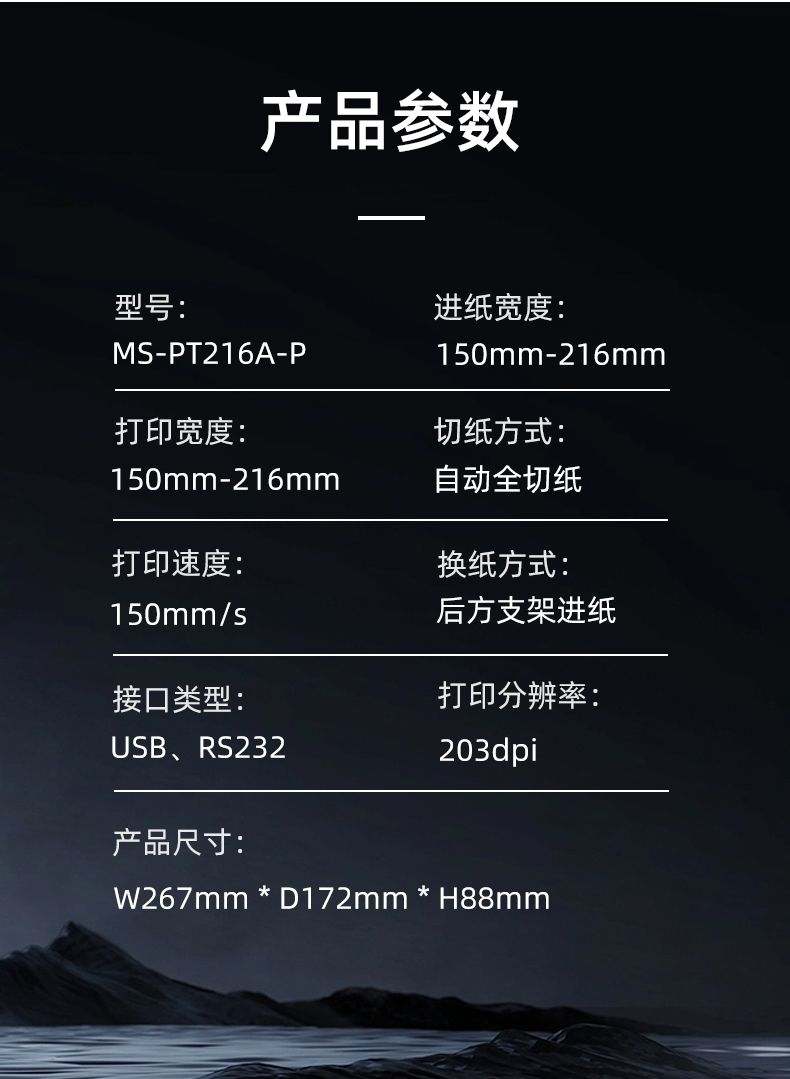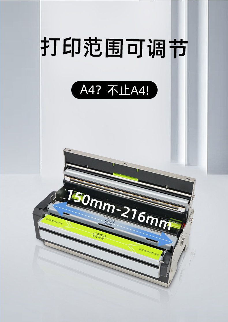 MS-PT216A-P_A4熱敏打印機, 一款全新大幅面熱敏打印機,打印寬度150mm-216mm可調(diào)節(jié)。 體積尺寸相比同類產(chǎn)品更為小巧。 打印速度可達(dá)150mm/s 有效容紙,杜絕打印過程中拉扯造成的卡紙 先打印完成并切紙,一次性把紙送出 容紙器可開蓋,維護(hù)方便快捷