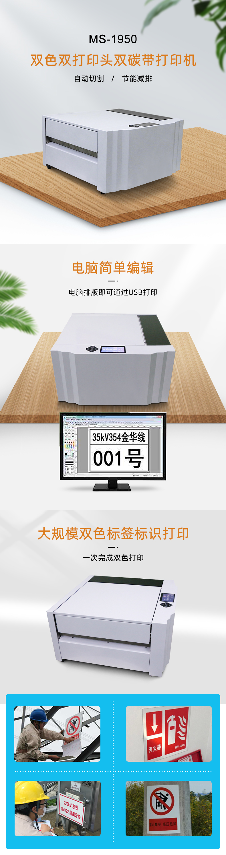 美松MASUNG自主研發(fā)熱轉印雙色標識牌打印機 1.打印大幅面標示牌,且自動切割 2.無需制版,電腦排版完通過USB打印,方便快捷 3.碳帶熱轉印方式打印,文字清晰耐刮永不褪色 4.支持PVC+貼合鋁箔復合材料、PVC標識貼紙材料等打印 5.熱轉印打印防水防曬耐腐蝕,經久耐用