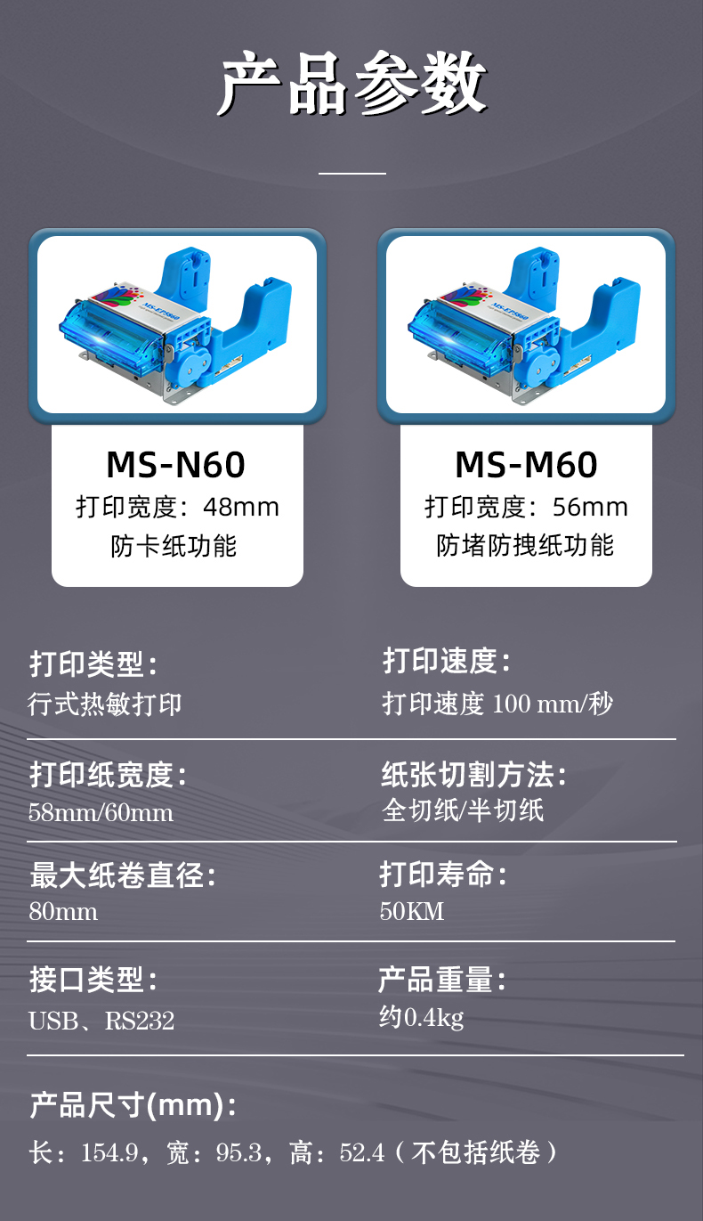 MS-N60/M60是美松全新研發(fā)的一款新的熱敏票據(jù)打印機,完全取代MS-D245熱敏票據(jù)打印機,可打印熱敏不干膠標(biāo)簽。MS-N60/M60對工作電壓進(jìn)行了全新的升級,現(xiàn)在的工作電壓在12V±5%V,使自助機的整體運行更方便,具有高亮LED燈光出紙嘴,可對打印頭溫度、缺紙、黑標(biāo)、紙將盡、防堵、防拽等熱門功能需要進(jìn)行配置,MS-N60/M60可應(yīng)用于自助快遞柜、商超存包柜、自助排隊機、自助取票機等多種自助票據(jù)設(shè)備 MS-N60打印的尺寸為48mm;MS-M60打印的尺寸為56mm,帶防堵防拽紙功能。