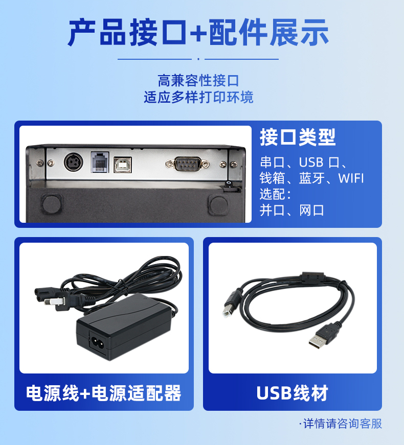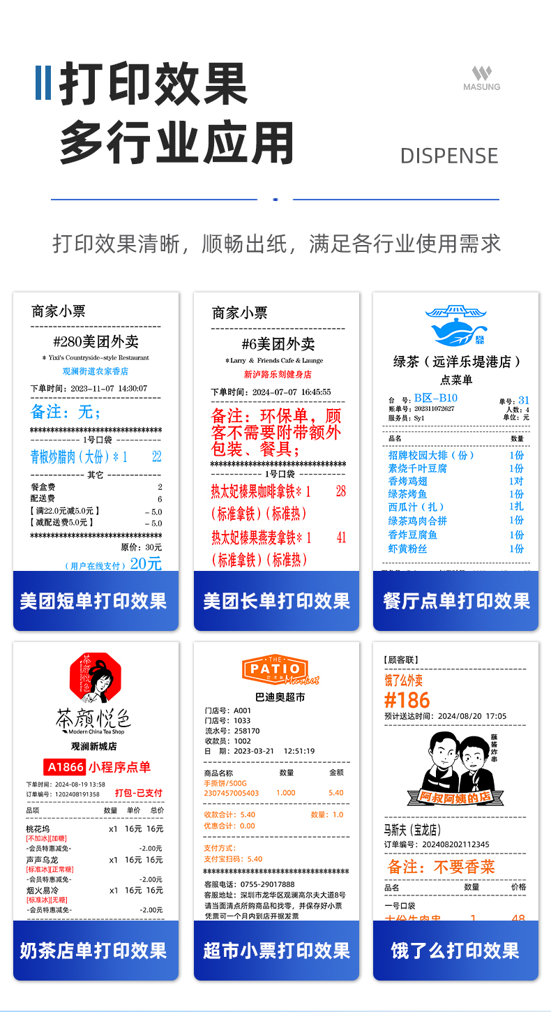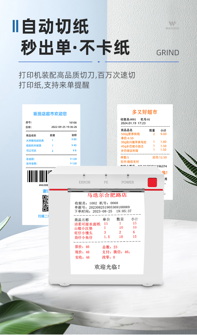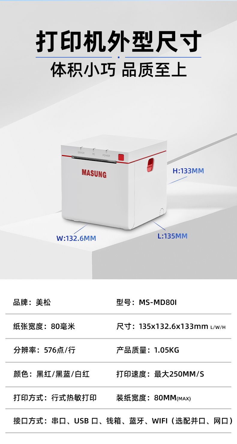 MD80I是一款高顏值的可桌面也可壁掛的票據(jù)打印機(jī)。MD80I外形四四方方的,圓潤一體設(shè)計(jì)、簡于外,精于內(nèi)。流線造型,外觀簡潔大方。顏色搭配顯得更加干凈整潔,可內(nèi)嵌于一些自助ai設(shè)備上,也可直接進(jìn)行使用。MS-MD80I是一款全能的桌面式壁掛式票據(jù)打印機(jī),適用于零售商超、中小電商、倉儲物管、影院娛樂等行業(yè)領(lǐng)域,支持簡體/繁體、英/日/韓文多種國際語言,新零售、跨境電商、影院更適合。MS-MD80I擁有超高速打印速度,采用高級強(qiáng)勁機(jī)芯,打印速度可高達(dá)250MM/S成為市面上同類產(chǎn)品中快速打印的佼佼者,清晰穩(wěn)定與高速皆可兼得帶來顧客滿分體驗(yàn)。MS-MD80I擁有豐富的可選接口,支持RS232串口、USB、網(wǎng)口,可選配藍(lán)牙、WiFi等接口、同時(shí)支持24V錢箱接入、滿足不同的連接需求。專業(yè)黑標(biāo)定位功能,前出紙打印,無線連接,藍(lán)牙接口連接,WiFi接口連接,USB連接,打印機(jī)外殼材質(zhì)高端,內(nèi)置機(jī)芯打印速度快。
