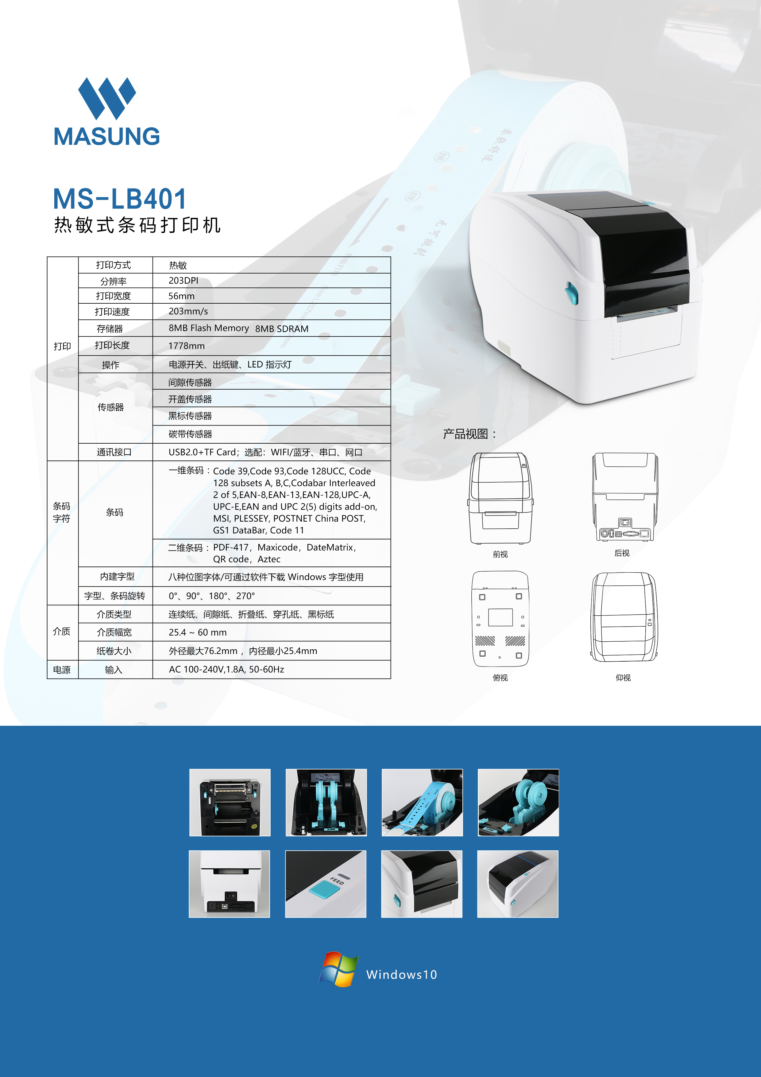 MS-LB401_熱敏熱轉印腕帶打印機,是由美松研發(fā)的一款熱敏熱轉印多類型的打印機,主要應用于醫(yī)療標簽腕帶的打印使用,它的體積小巧,同時還具有高速度的打印功能。 MS-LB401具有多種接口類型,可通過藍牙,WIFI和網(wǎng)口、串口等多種方式進行連接傳輸,可使用的打印介質有腕帶紙和連續(xù)紙、間隙紙和折疊紙、穿孔紙和黑標紙 內部配有限紙和限位器能快速的裝紙進行打印