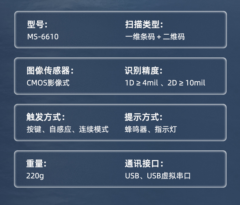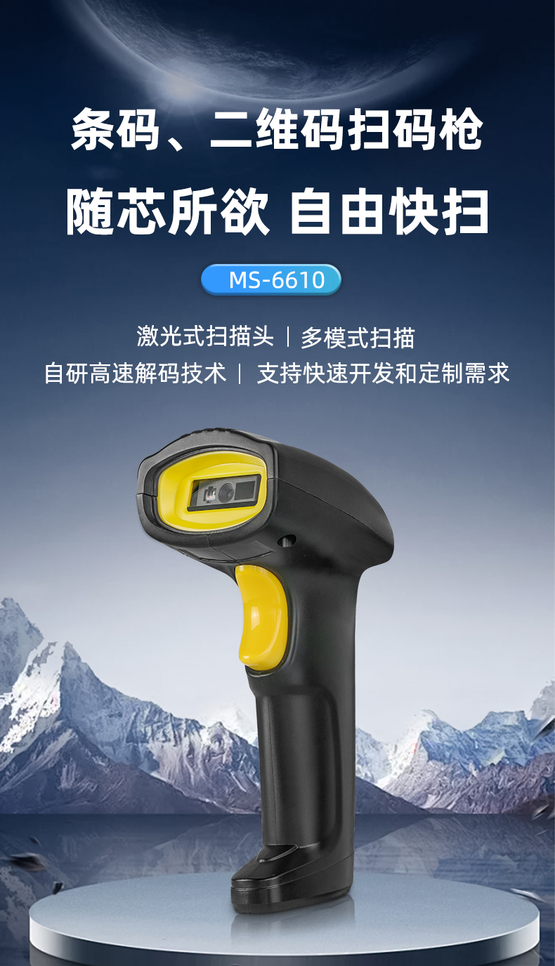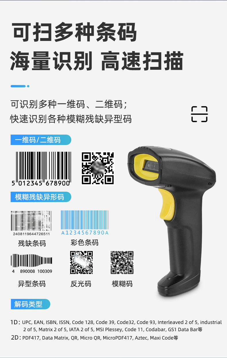 產品特點: 全局高速解碼技術 采用自主研發(fā)的核心技術,極速響應, 支持快速開發(fā)和定制需求 采用二維掃描技術 兼容一維碼和二維碼的讀取 手機和紙質條碼讀取 采用高速曝光算法,兼容手機碼和紙質碼的快速讀取 支持多國鍵盤 對不同國家場景可配置對應輸出鍵盤 人體工學設計 采用經(jīng)典的人體工學設計,符合用戶使用習慣 全ASCII數(shù)據(jù)編輯 支持全ASCII數(shù)據(jù)編輯,可配置輸出結果格式 支持開票模式 可配置為開票模式,實現(xiàn)發(fā)票碼格式轉換及輸出