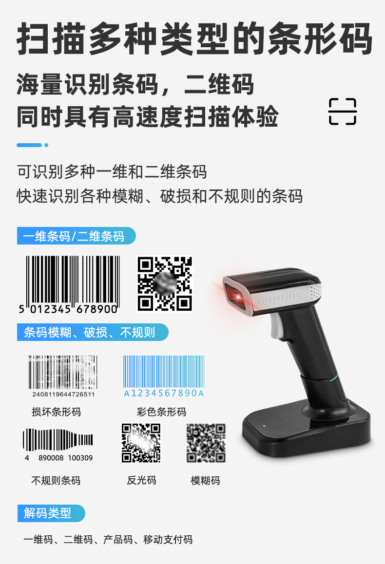 MS-6650Z是一款手持式的無線帶平臺掃碼槍,外觀特性在于,不需要使用連接線,無線USB接收器連接,配備桌面平臺用于收納擺放和充電;產(chǎn)品特點(diǎn)在于: 全局高速解碼技術(shù) 采用自主研發(fā)的核心技術(shù),極速響應(yīng), 支持快速開發(fā)和定制需求 采用二維掃描技術(shù) 兼容一維碼和二維碼的讀取 支持多國鍵盤 對不同國家場景可配置對應(yīng)輸出鍵盤 人體工學(xué)設(shè)計 采用經(jīng)典的人體工學(xué)設(shè)計,符合用戶使用習(xí)慣 手機(jī)和紙質(zhì)條碼讀取 采用高速曝光算法,兼容手機(jī)碼和紙質(zhì)碼的 快速讀取