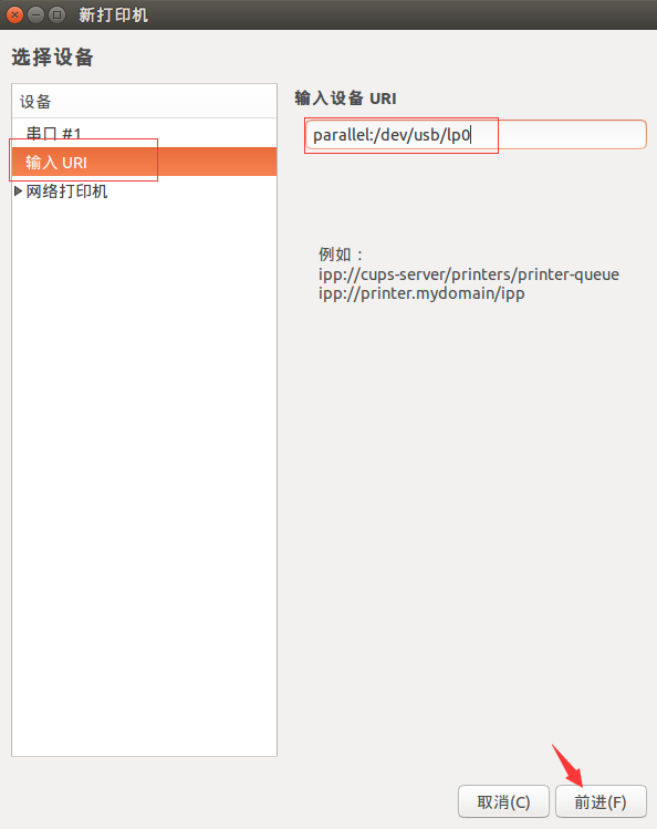 選擇 “輸入U(xiǎn)RI”,并輸入 “parallel:/dev/usb/lp0”,然后點(diǎn)擊前進(jìn)。