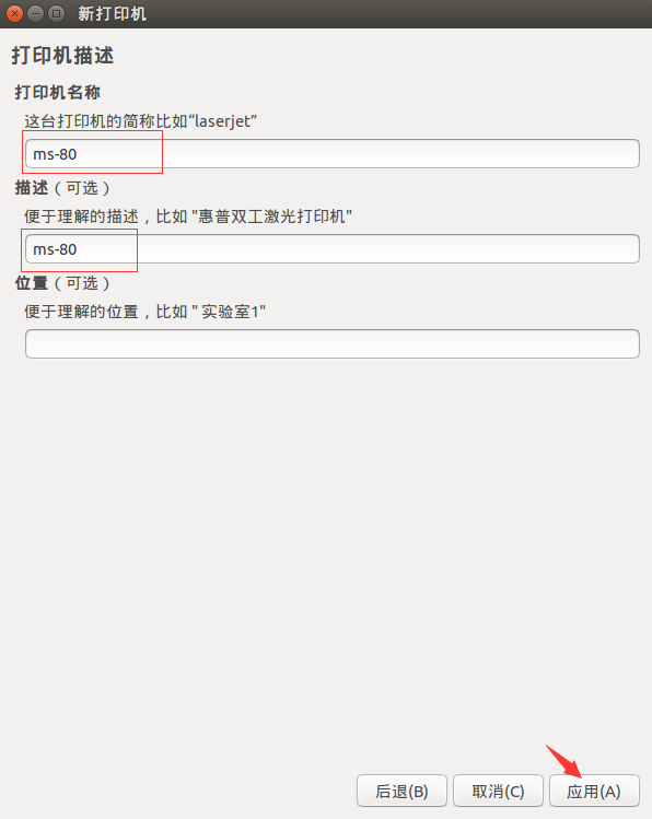 設(shè)置打印機(jī)名稱(chēng)(自定義)和打印機(jī)描述(自定義),然后點(diǎn)擊應(yīng)用即可。
