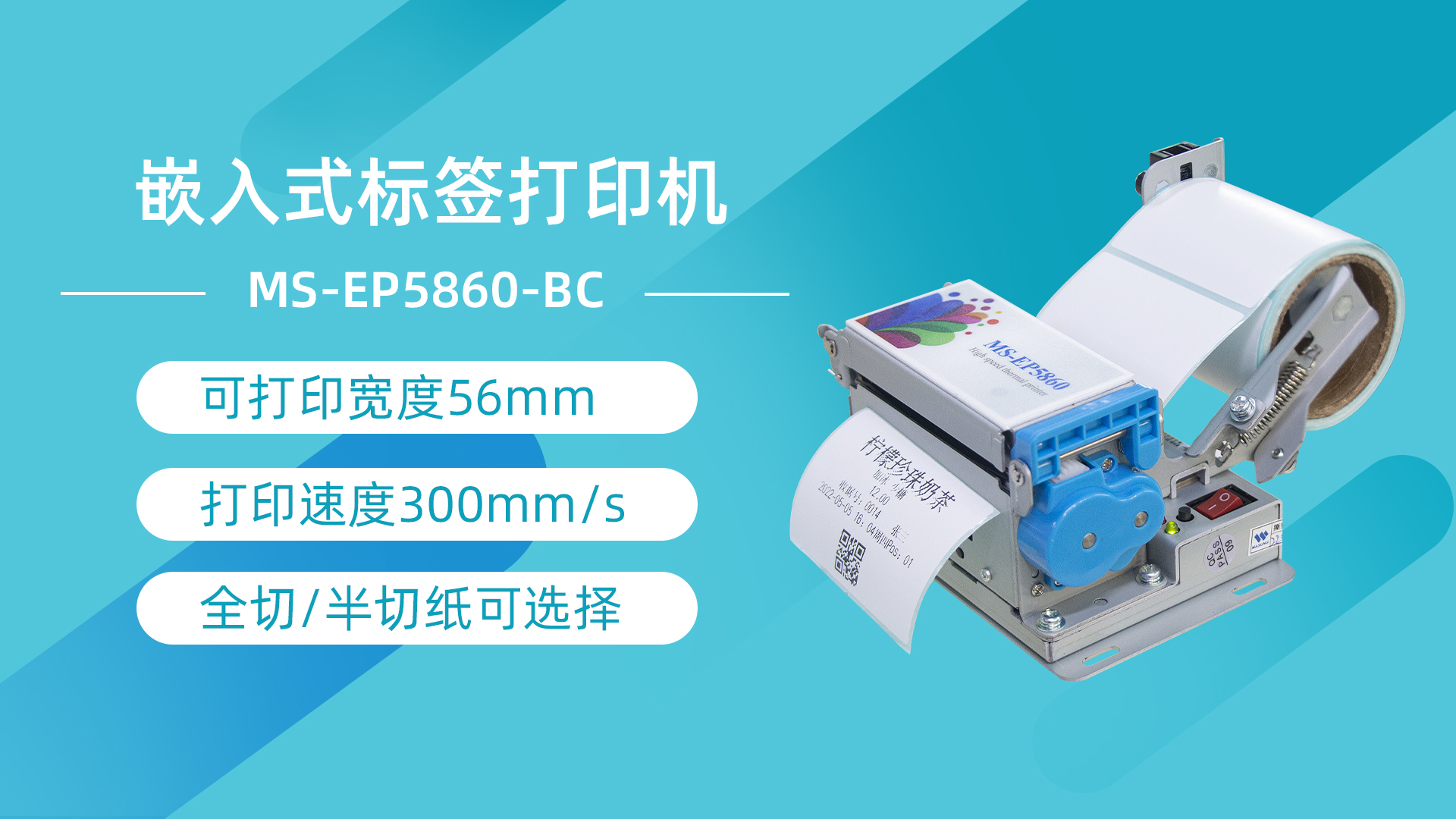 美松自助標(biāo)簽打印機MS-EP5860-BC采用的是標(biāo)準(zhǔn)通訊接口,可在不同通訊情況下使用不同的通訊接口,采用了大齒輪嵌入,打印走紙力度大,速度快,側(cè)翻蓋打印頭的設(shè)計,可以讓卡紙維護更加簡單便捷。打印機支持全切、半切兩種輸出模式,滿足顧客不同的使用需求,另外還具有探縫傳感器功能檢測,適用于打印紙帶間隙不干膠熱敏紙。機身外觀小巧,方便嵌入在不同的終端設(shè)備中,同時支持二次開發(fā),提供開發(fā)資料,可裝入紙卷直徑 80mm,也可調(diào)節(jié)紙倉支架。